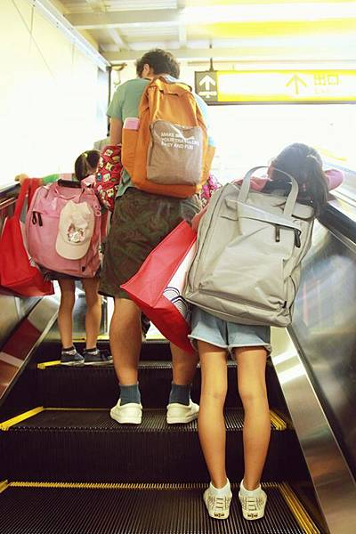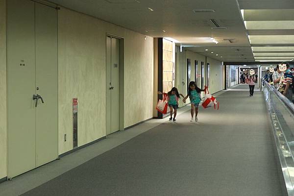睡飽的孩子們 開心的在有輸送帶的電梯旁奔跑...